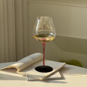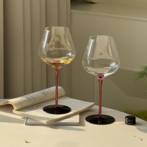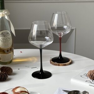 The wide bowl enhances the bouquet of delicate red wines like Pinot Noir, while the cold-cut rim, thin bowl walls, and sturdy flat base ensure both elegance and everyday usability. The slender stem, available in deep red or matte black, not only insulates the wine from hand warmth but also brings a touch of modern sophistication to the classic silhouette.