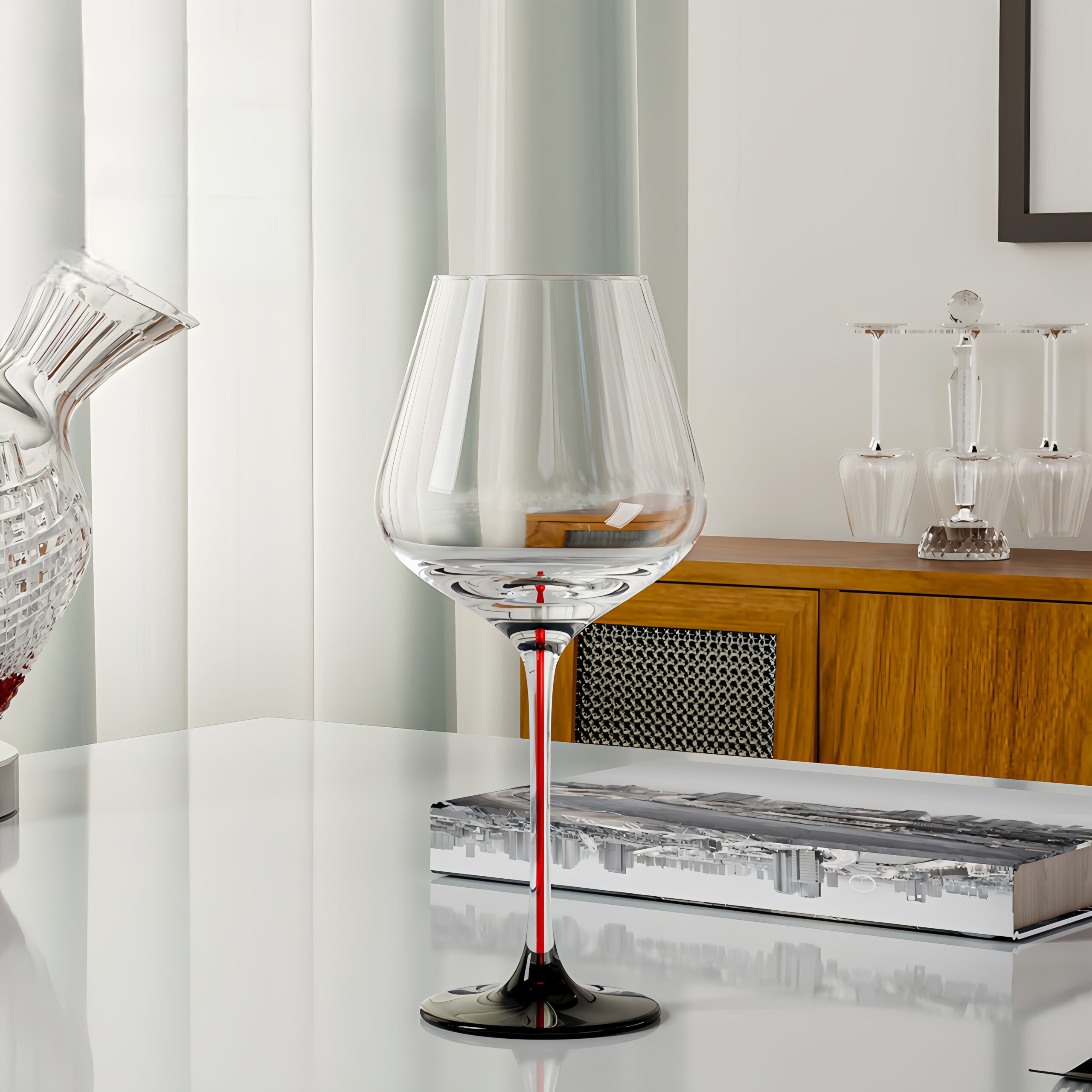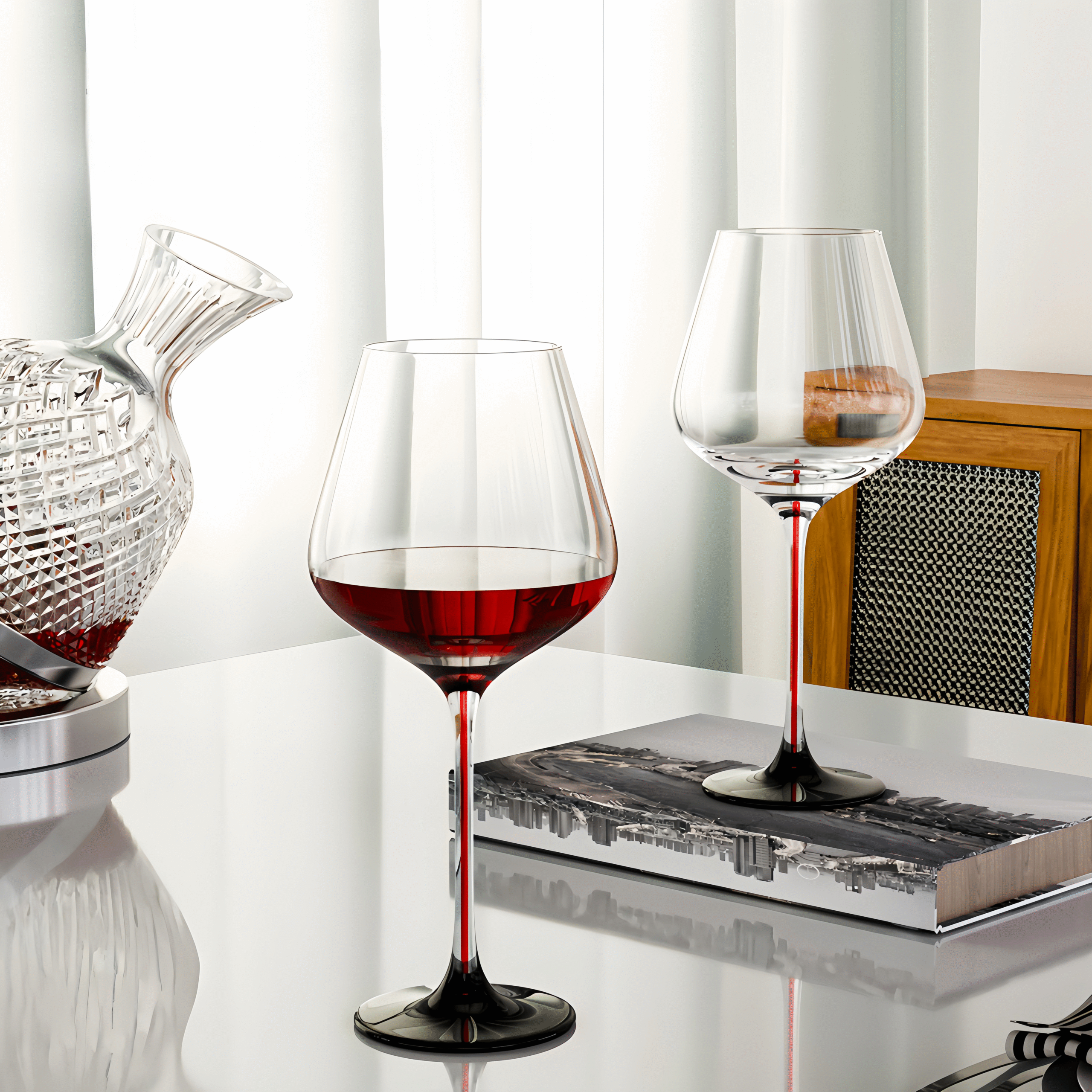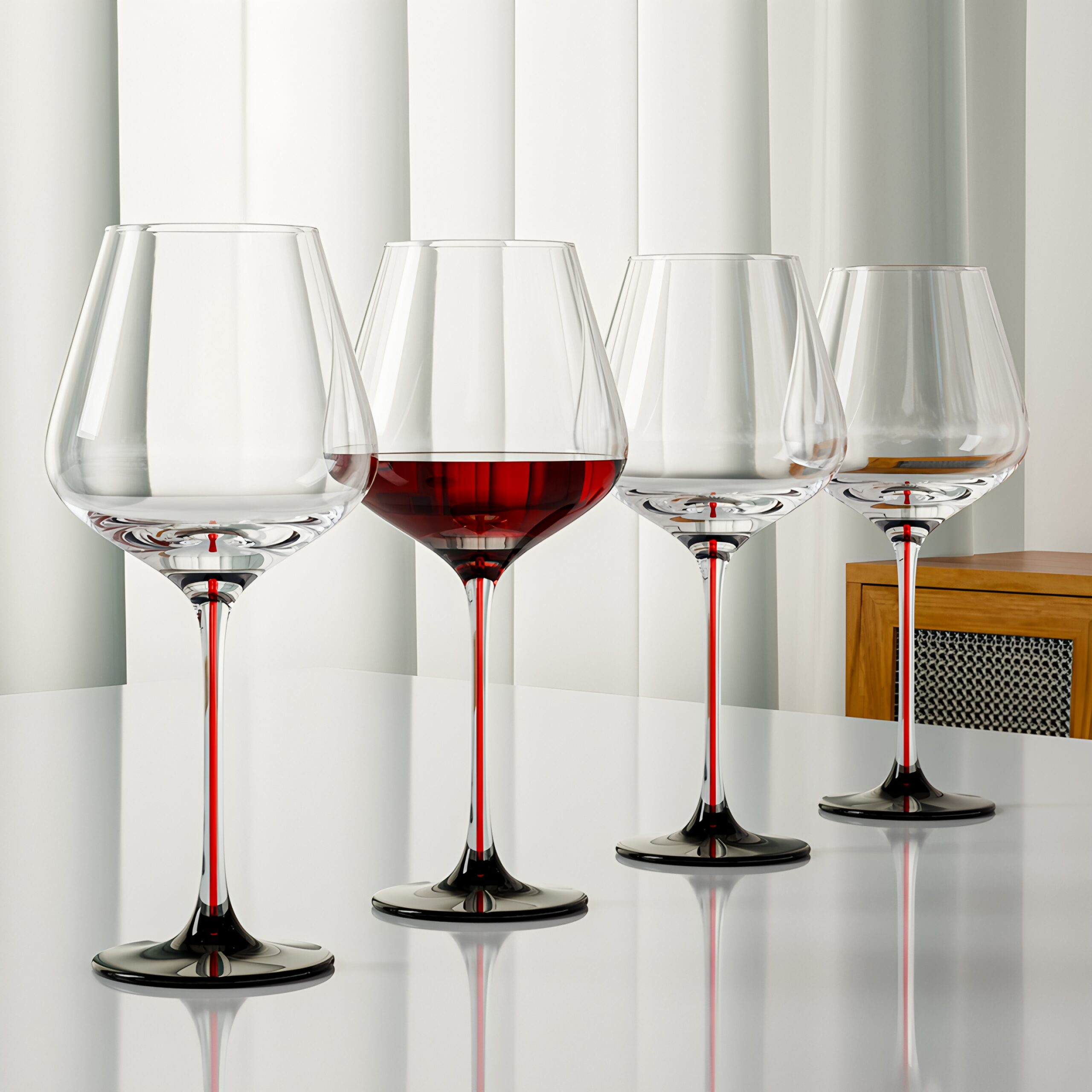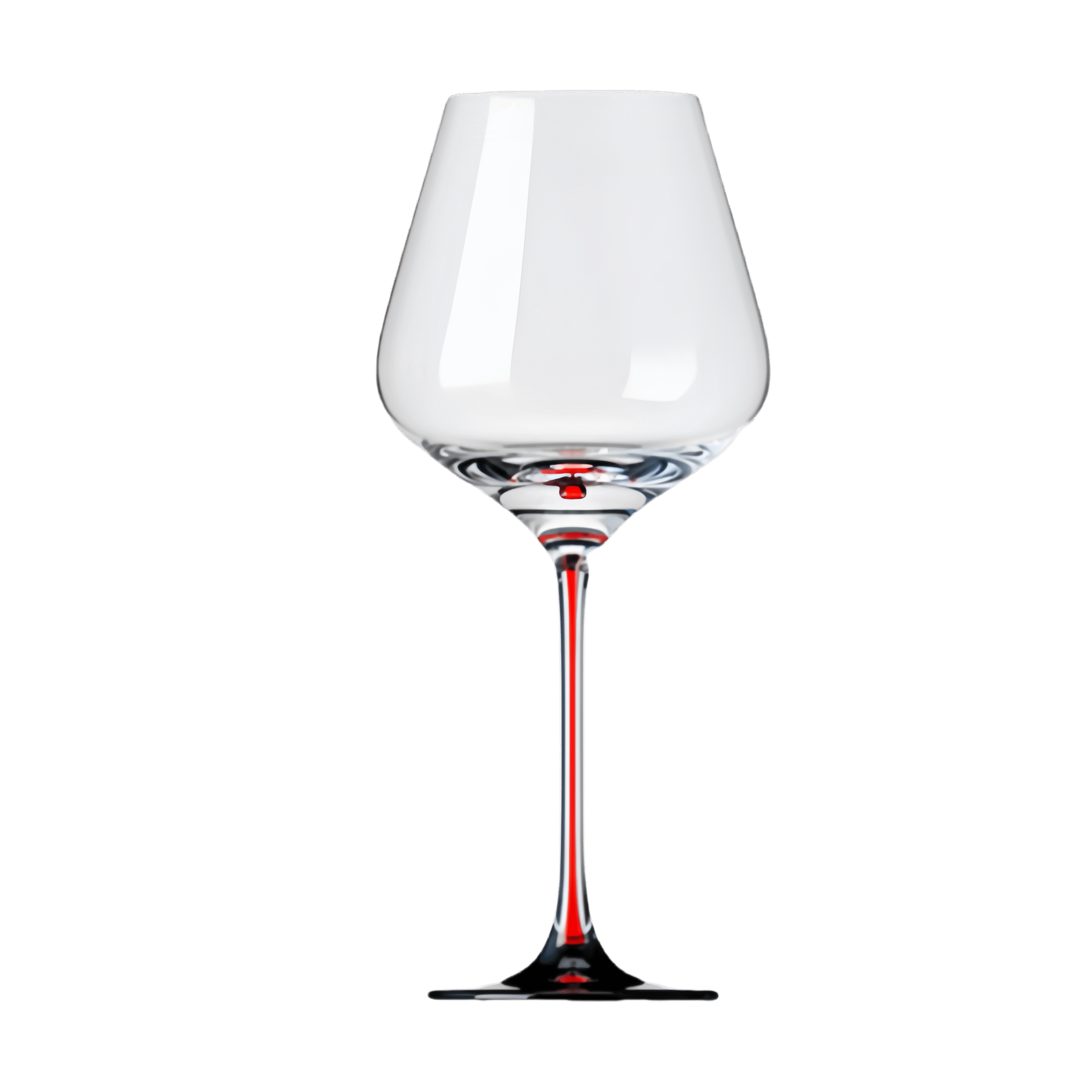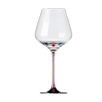Elegant 650ml crystal Burgundy glasses with red bow stems – machine-made for brilliance, clarity, and crisp resonance.