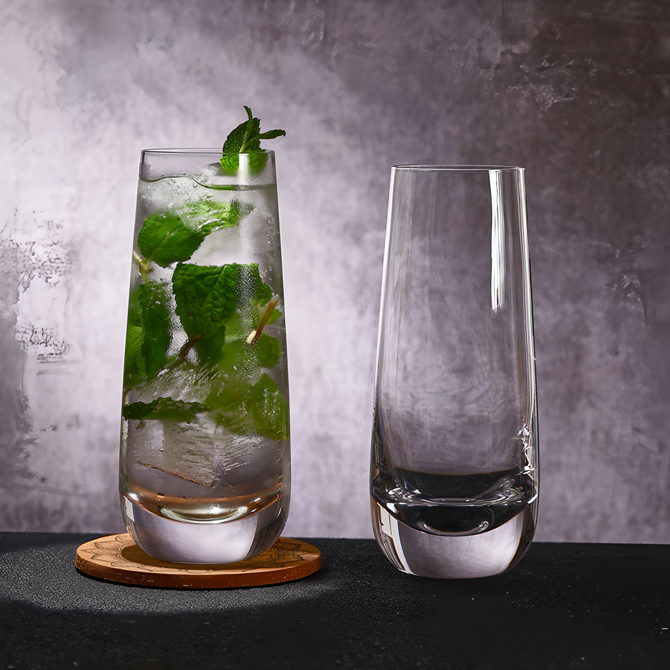 Sleek and gently tapered, the Drop Highball glass is designed for modern mixology and casual elegance. With a thick base and clear silhouette, it’s perfect for serving cocktails, spritzers, or sparkling tea with style and stability.